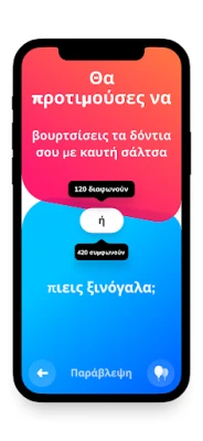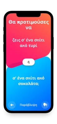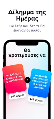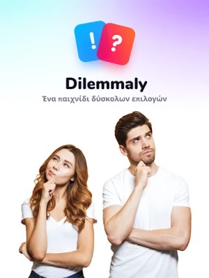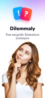 Ανακαλύψτε το Dilemmaly - θα προτιμούσες?, την εφαρμογή που σας προκαλεί με δύσκολες και ξεκαρδιστικές ερωτήσεις διλημμάτων. Συγκρίνετε τις απαντήσεις σας με φίλους, οικογένεια και εκατομμύρια άλλους παίκτες. Με πάνω από 1.000 δωρεάν κάρτες, η διασκέδαση είναι εγγυημένη.