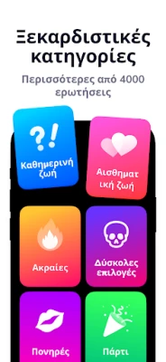 Η ποικιλία είναι το κλειδί για ασταμάτητη ψυχαγωγία, και το Dilemmaly - θα προτιμούσες? το γνωρίζει καλά. Βυθιστείτε σε μια πληθώρα κατηγοριών που καλύπτουν κάθε γούστο: από καθημερινά σενάρια που σας βάζουν σε σκέψεις, μέχρι ακραίες καταστάσεις που θα δοκιμάσουν τα όριά σας, αλλά και ρομαντικά διλήμματα που θα αποκαλύψουν τις πιο κρυφές σας προτιμήσεις. Με μια τόσο ευρεία γκάμα, είναι αδύνατο να βαρεθείτε – κάθε νέα κάρτα φέρνει μια φρέσκια πρόκληση και αφορμή για συζήτηση.