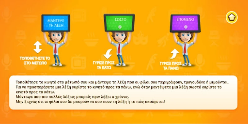 Η λειτουργία του **Παντομίμα – Μάντεψε τη λέξη** είναι παιχνιδιάρικα απλή, αλλά ταυτόχρονα εξαιρετικά εθιστική. Αφού ορίσετε το χρονικό όριο και επιλέξετε την αγαπημένη σας θεματική κατηγορία, απλά κρατήστε τη συσκευή στο μέτωπό σας. Οι συμπαίκτες σας θα προσπαθήσουν να σας περιγράψουν ή να σας υποδυθούν τη λέξη που εμφανίζεται στην οθόνη. Μαντέψατε σωστά; Γυρίστε το τηλέφωνο προς τα κάτω για να περάσετε στην επόμενη πρόκληση. Αν μια λέξη σας δυσκολεύει, ένα γρήγορο γύρισμα προς τα πάνω σας οδηγεί στην επόμενη, επιτρέποντάς σας να μεγιστοποιήσετε τον αριθμό των σωστών απαντήσεων πριν τελειώσει ο χρόνος.