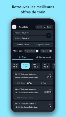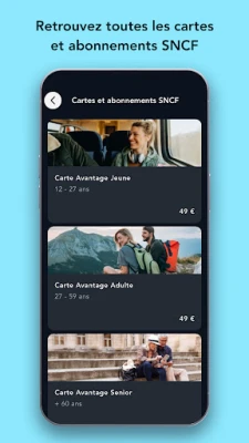 Με την SNCF Connect, η οργάνωση του ταξιδιού γίνεται παιχνίδι. Ανακαλύψτε αβίαστα την ιδανική διαδρομή, συγκρίνοντας επιλογές από ένα ευρύ φάσμα μέσων μεταφοράς: τρένα (TGV INOUI, OUIGO, Eurostar, κ.ά.), αστικές συγκοινωνίες (μετρό, λεωφορεία, τραμ), ακόμα και υπηρεσίες συνεπιβατισμού (Blablacar). Βρείτε τις καλύτερες τιμές και επιλογές, με τη δυνατότητα να ορίσετε ειδοποιήσεις για οικονομικά εισιτήρια ή πληρότητα. Η αγορά και η διαχείριση των εισιτηρίων, των καρτών ή των συνδρομών σας γίνεται με λίγα μόνο κλικ, ενώ μπορείτε να φορτίσετε και το πάσο Navigo σας απευθείας από το τηλέφωνο. Όλες οι πληρωμές σας είναι ασφαλείς, και το προφίλ ταξιδιώτη σας διατηρεί αποθηκευμένες τις προτιμήσεις και τις κάρτες σας, για ακόμα πιο γρήγορες κρατήσεις.